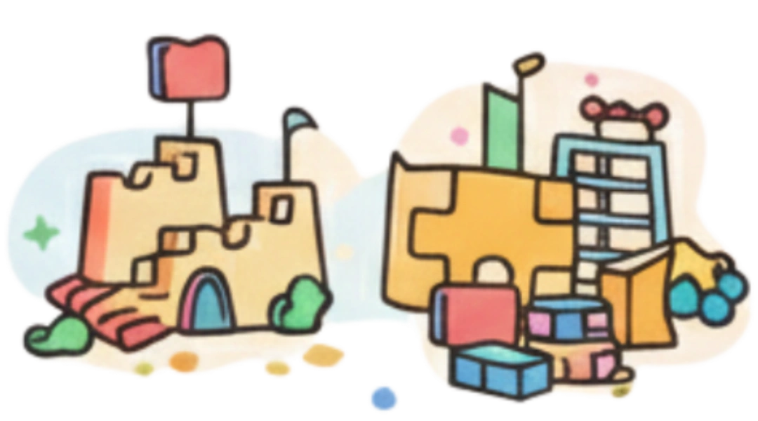 Hands-on fun with building blocks, DIY sand castles, stick-to-the-wall, rainbow ladders, and puzzle play that enhance creativity, problem-solving, and motor skills.