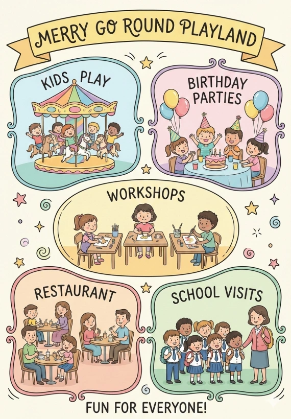 Looking for a kids play area in Hyderabad? Merry Go Round – Playland! offers indoor play, birthday parties, school visits, workshops, and a family-friendly café experience.